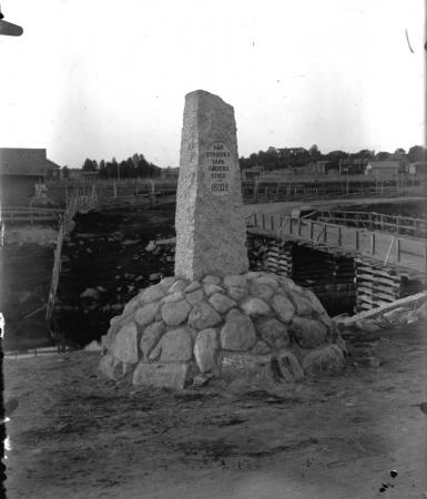 | Monumentet med Finby bro och gårdar i bakgrunden | |